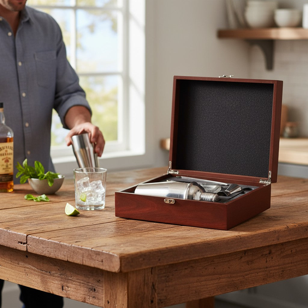 This classy rosewood finish boxed martini shaker set is an ideal gift for the classy cocktail connoisseur! Our 5 piece cocktail shaker set is presented in a stunning box, complete with custom personalized engraving of your choice! Housewarming Gift, Wedding Gift, New Home Gift, Groomsman Gift - the possibilities are endless!