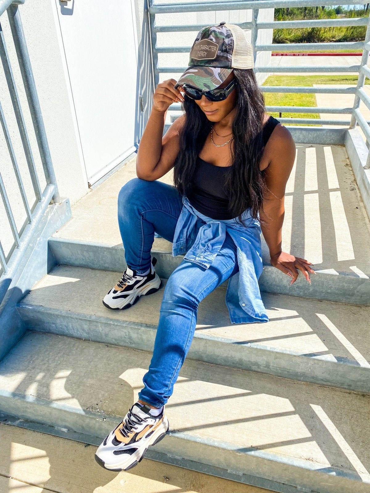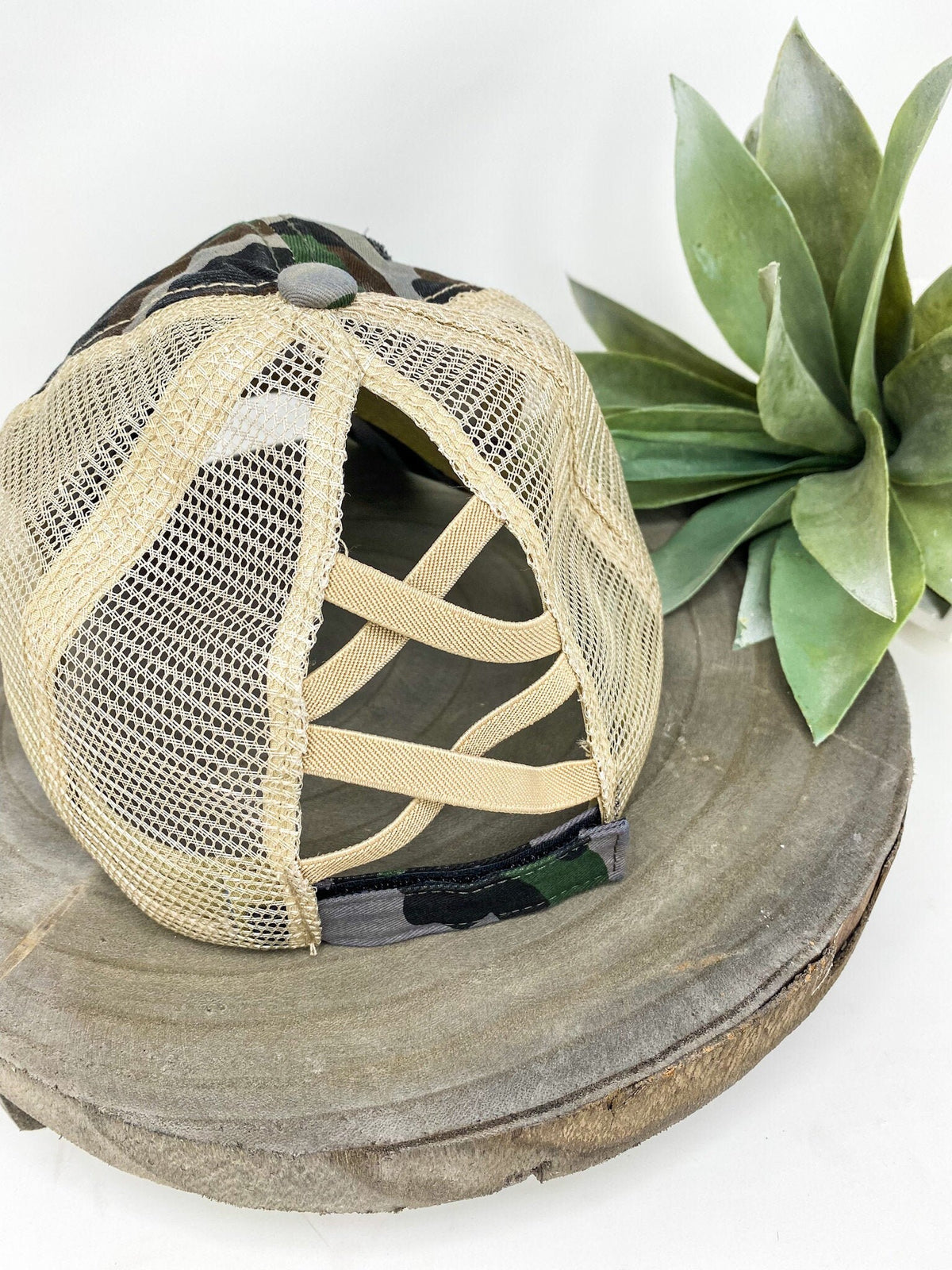 CAMO MESSY BUN/HIGH PONYTAIL DISTRESSED TRUCKER CAP