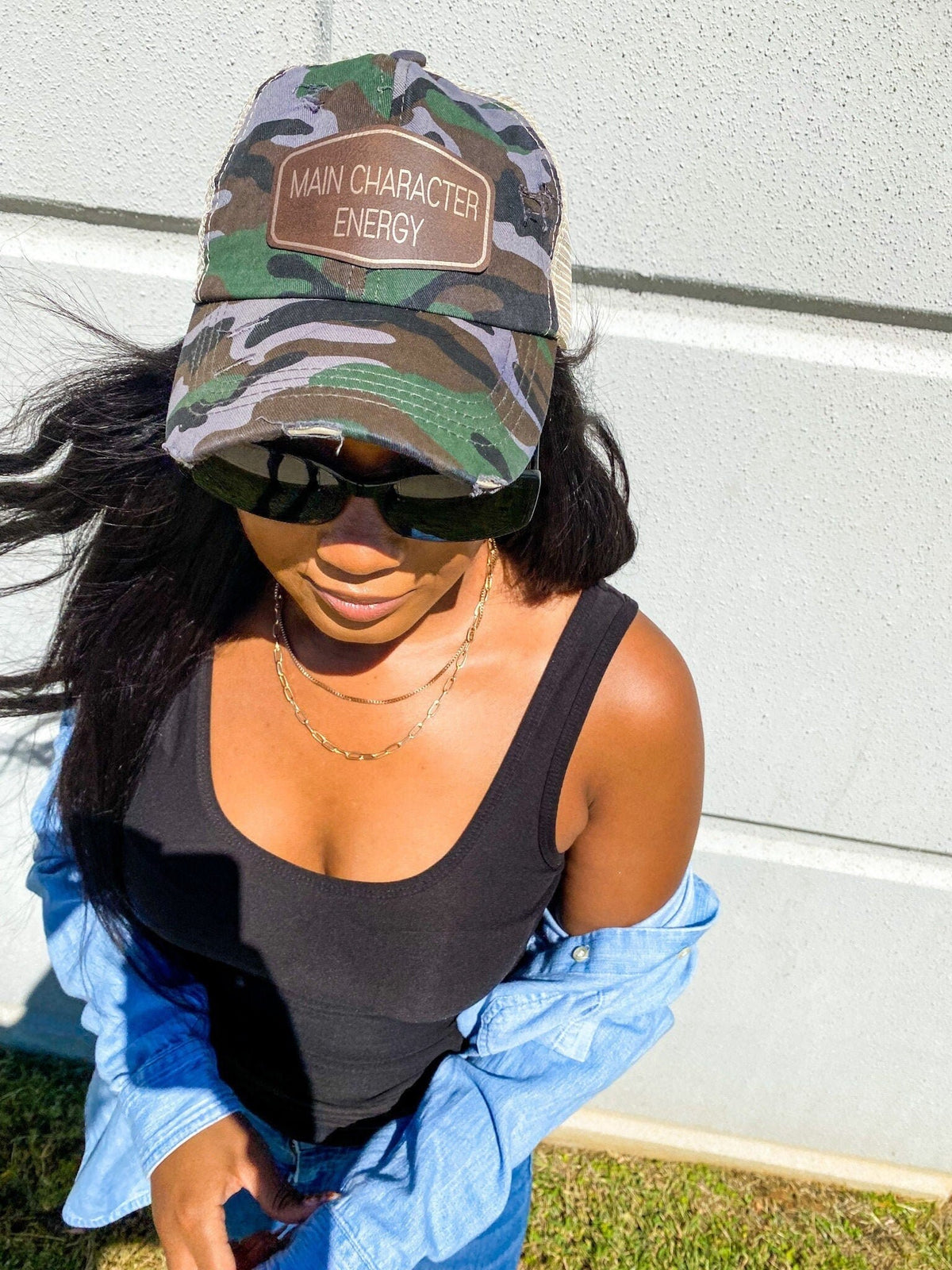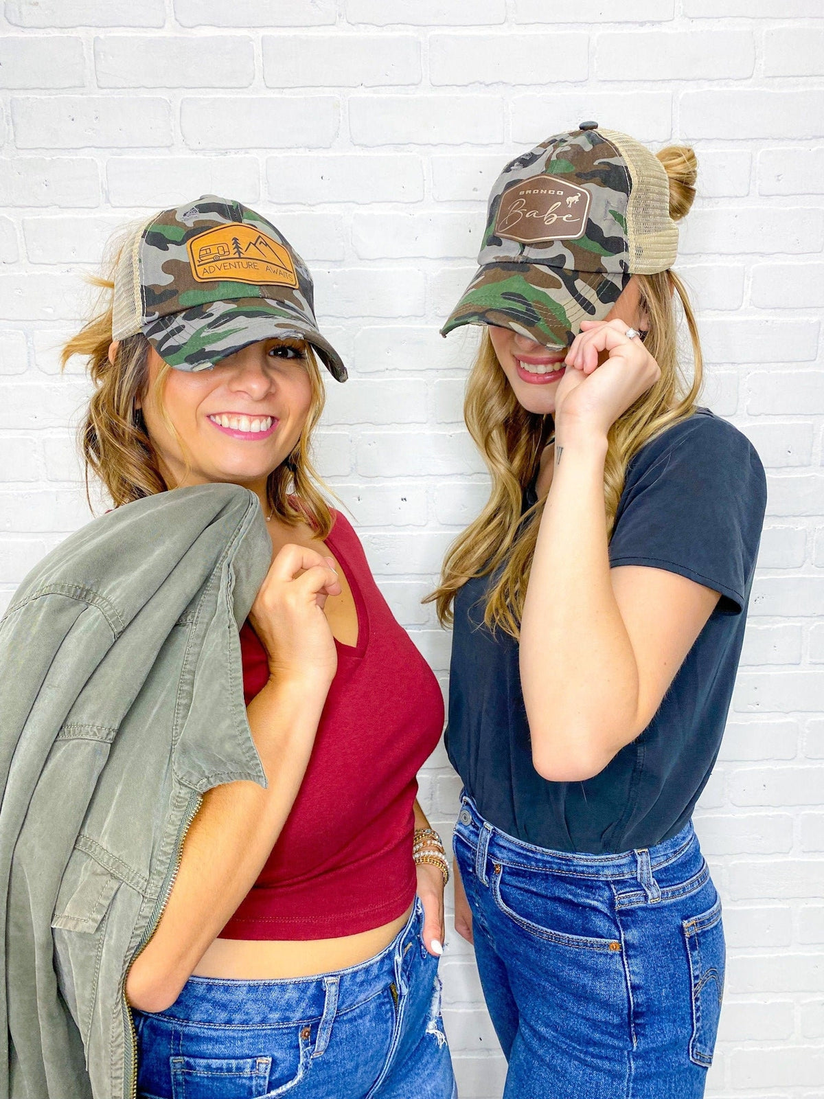 Personalized Camo Hat, Mom hat, messy bun hat, leather patch hat, Camo Baseball hat, Day drinker hat camo ponytail hat