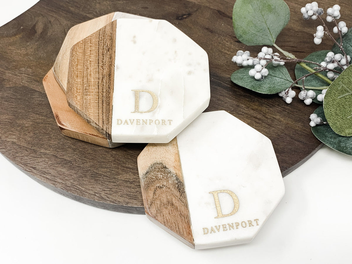 These personalized engraved marble & wood octagon coasters are a perfect gift to celebrate your favorite couple's special day!