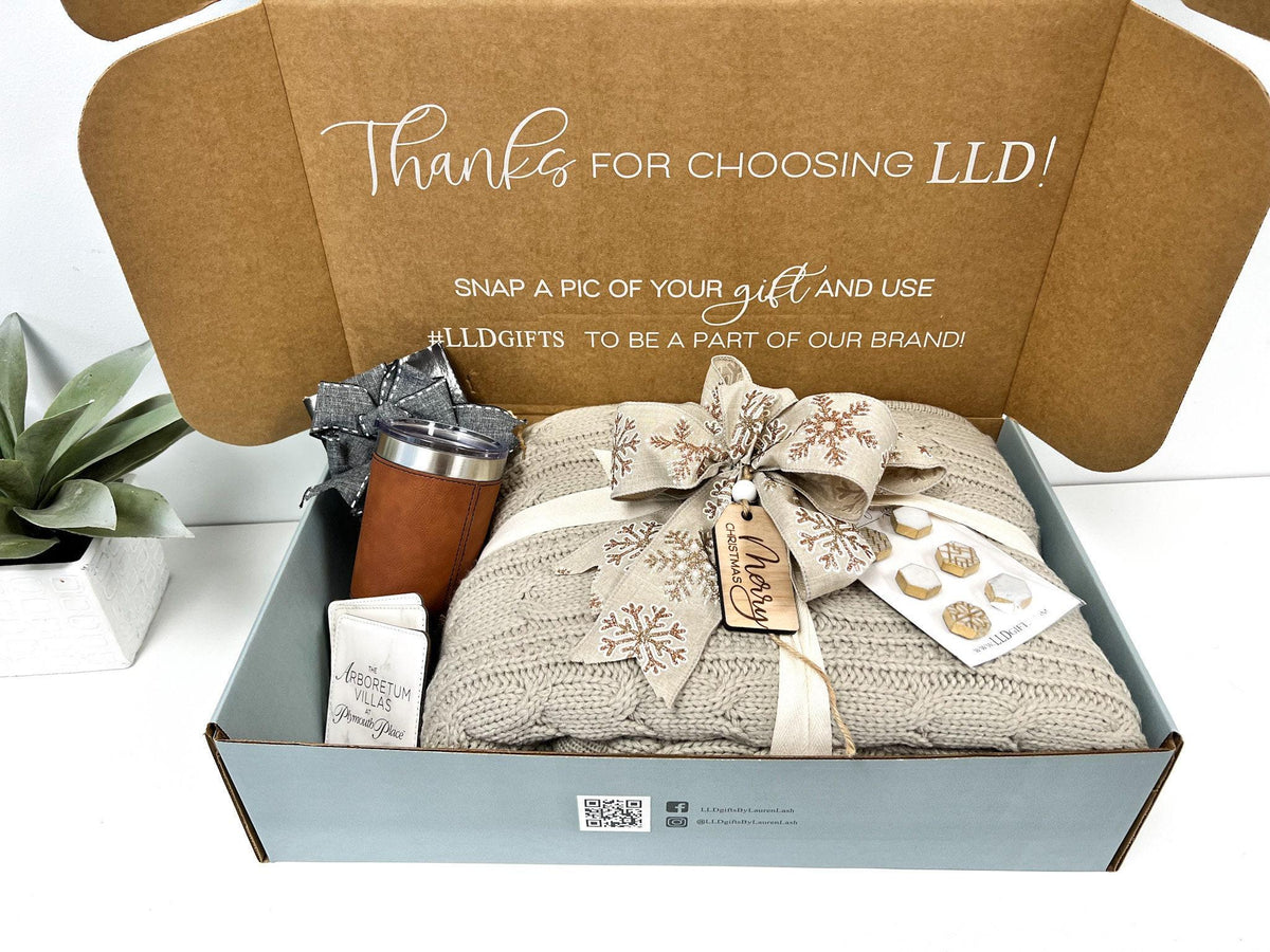 Browse our curated collections and pick the gift that speaks to your brand, team, or client—whether it’s a cozy blanket, elegant barware, or a custom charcuterie board.