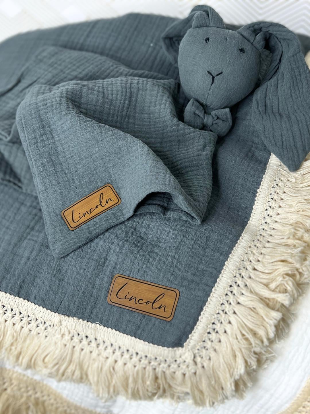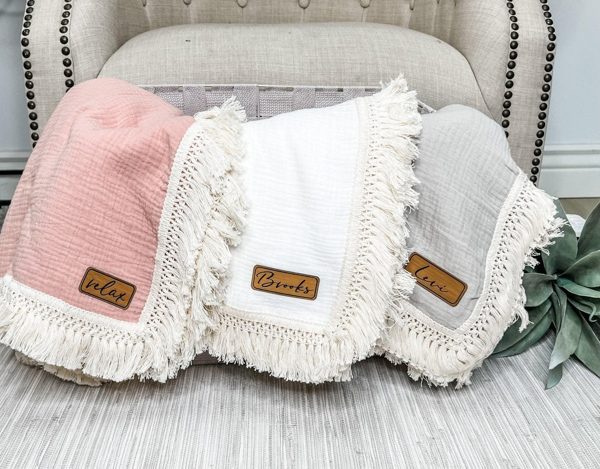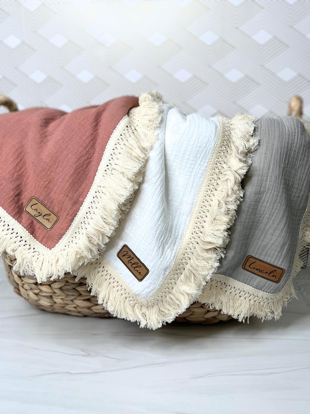Wrap your little one in comfort and style with this personalized baby blanket. This custom name blanket is made from soft, breathable muslin fabric, perfect for newborns and toddlers alike. Its delicate fringe adds an elegant touch, making it ideal for nursery decor or as a baby shower gift. Whether you're welcoming a new baby, celebrating a birth announcement, or looking for the perfect monogrammed gift, this blanket is a timeless keepsake. Great for baby boys and girls, it also serves as a beautiful baptism or baby quilt.