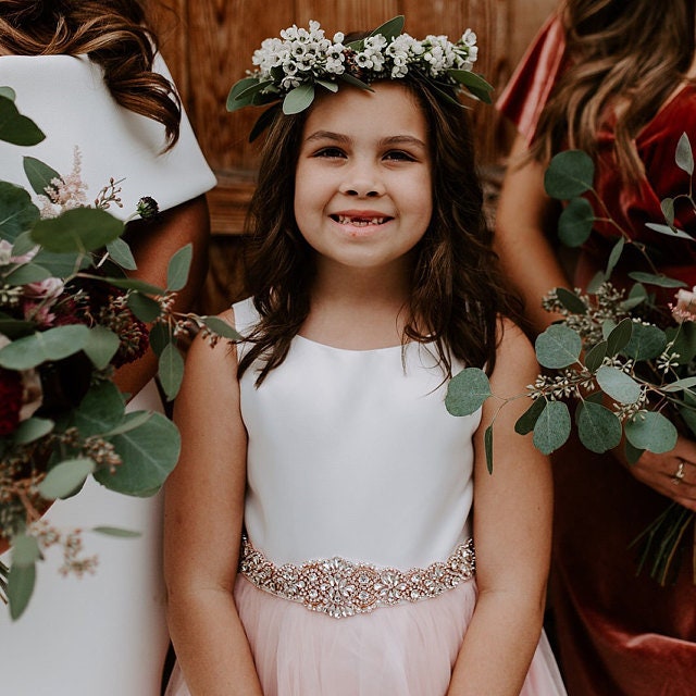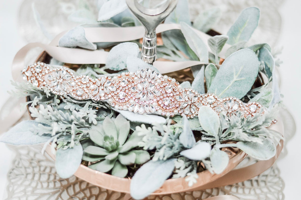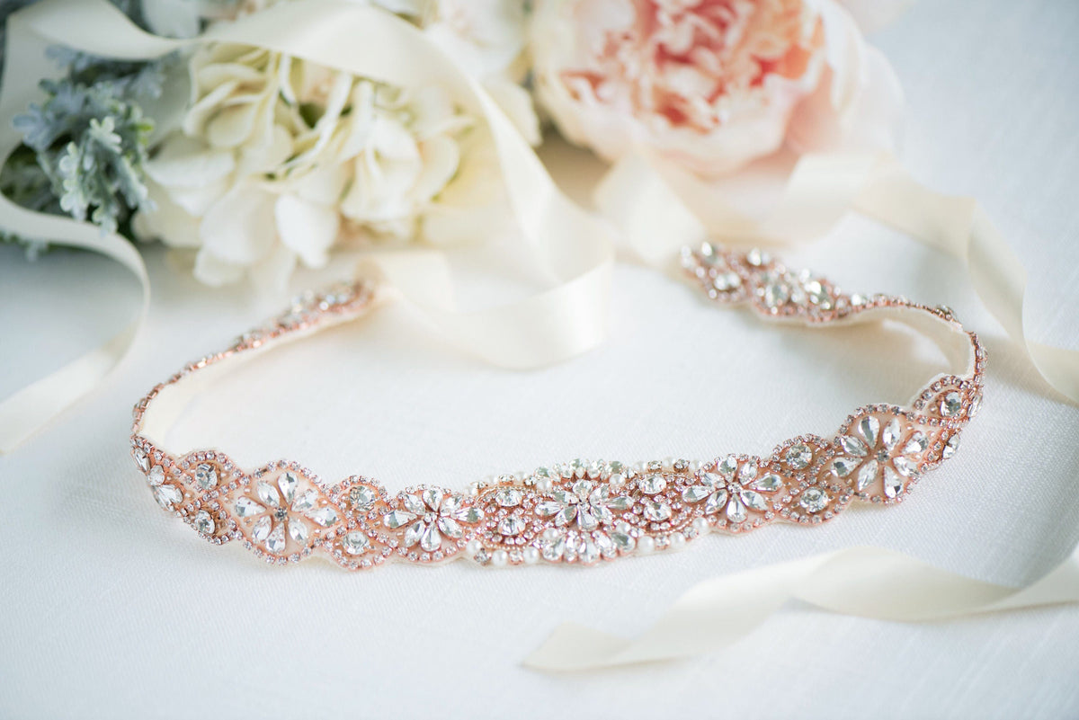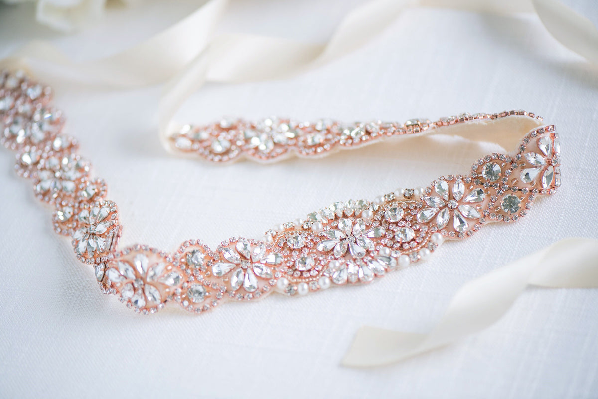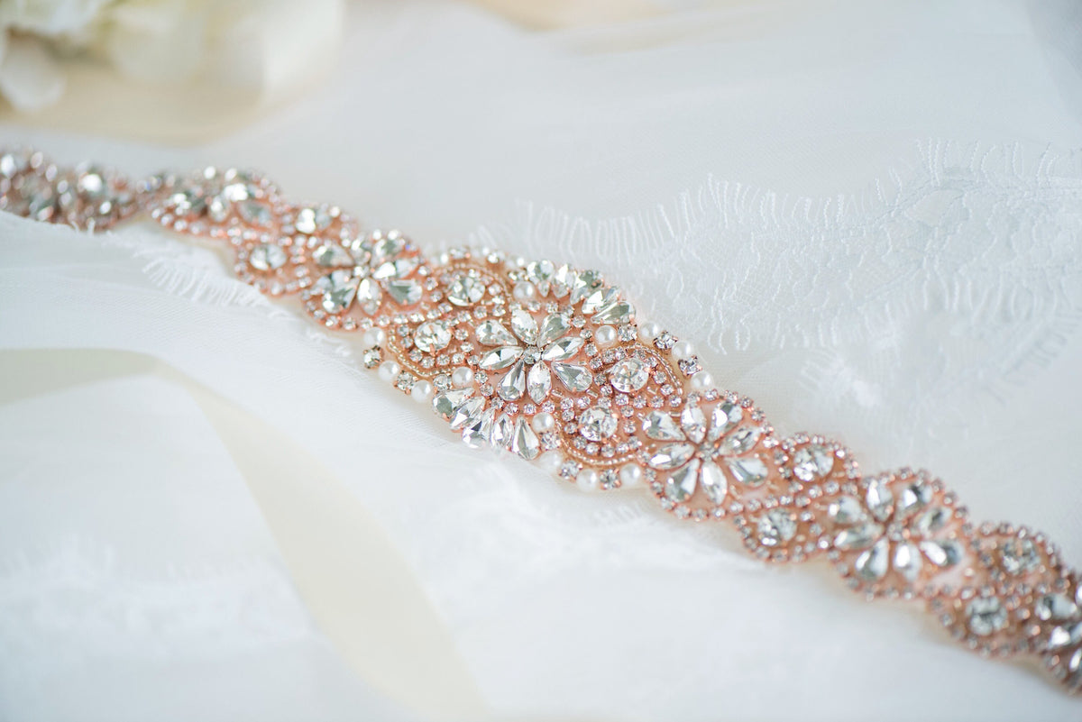 Elegant Rose Gold belt is made with the high quality Austrian crystals, pearls, beads and rhinestones.