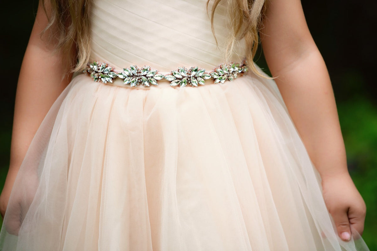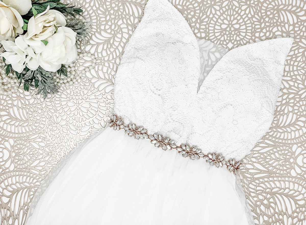 Crystals come in various lengths. Set on luxurious satin or organza that ties in the back. This sash can also be sewn to the dress.