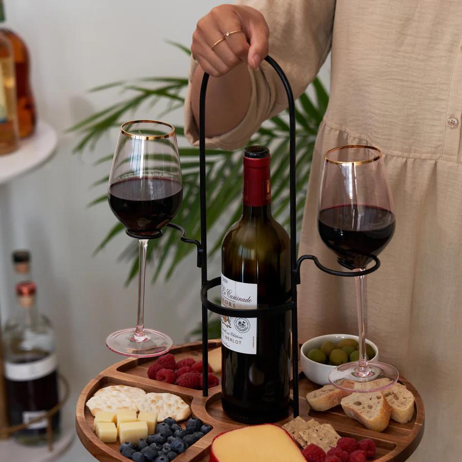 Serve a decadent cheese and charcuterie spread along with your favorite wine. Crafted from acacia wood, this cheese and wine caddy includes a built-in holder for a wine bottle and two stemmed wine glasses. It’s the perfect cheese and wine board for two.