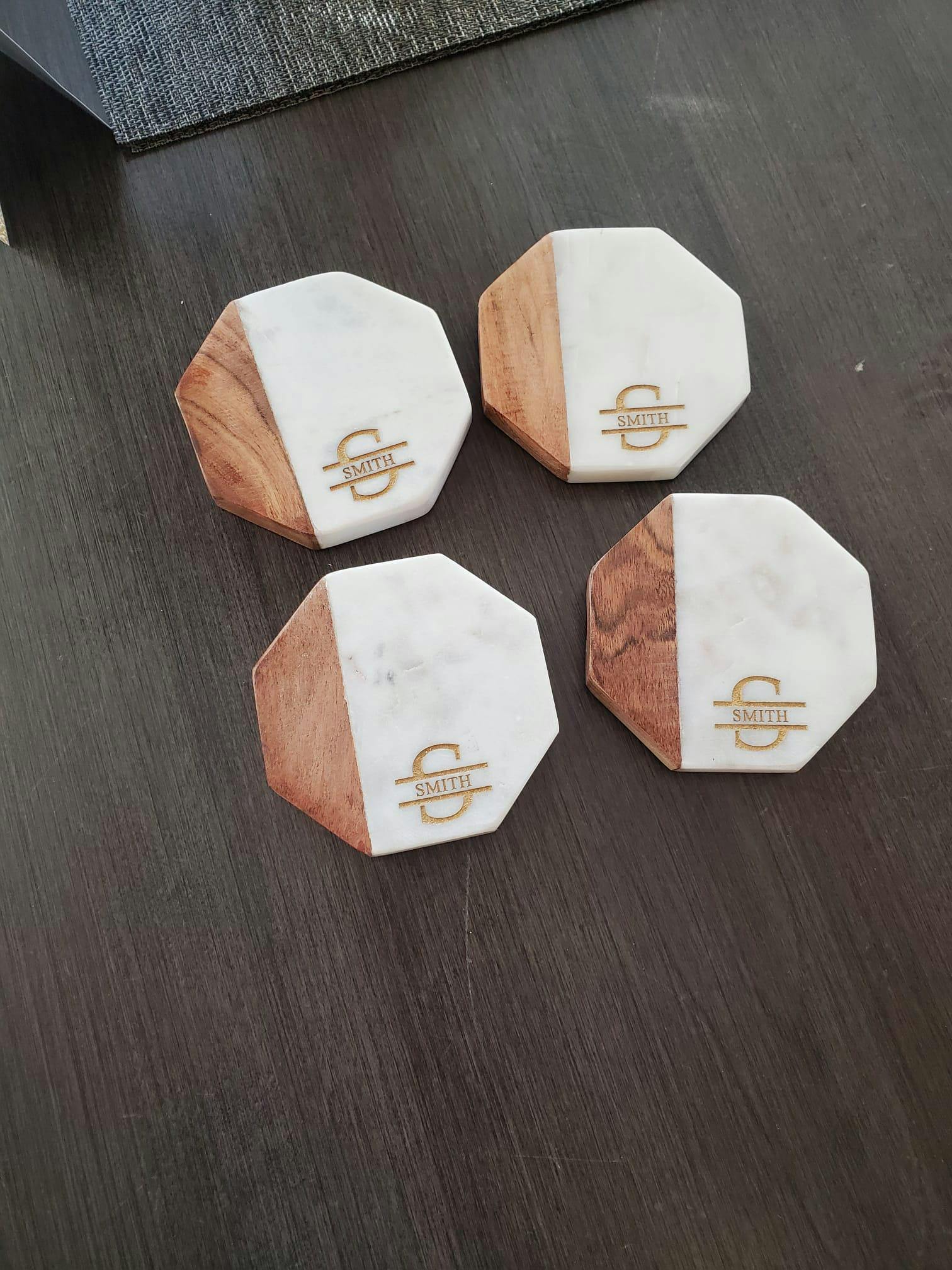 ✨ Indulge in the perfect blend of elegance and functionality with our Personalized Wood and Marble Coaster Set.