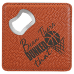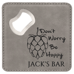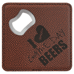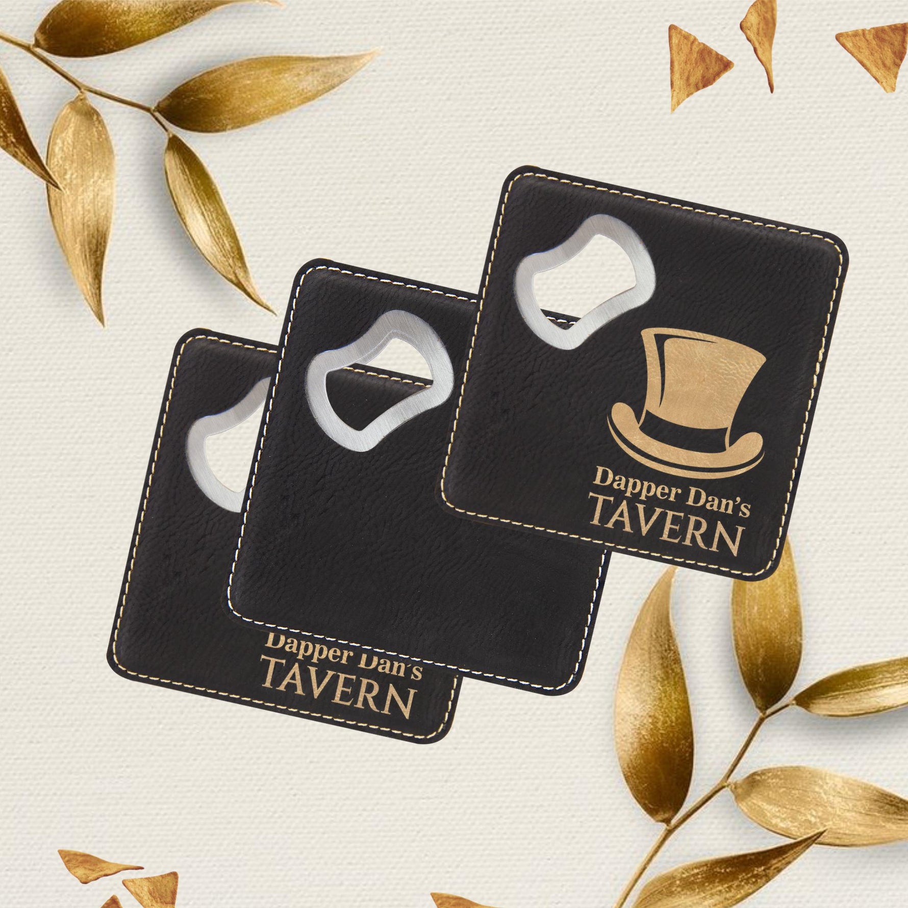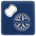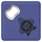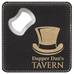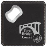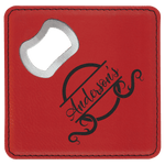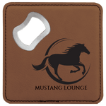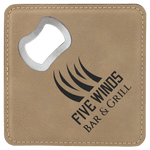 * Durable 4x4 inch square leatherette coaster with integrated metal bottle opener